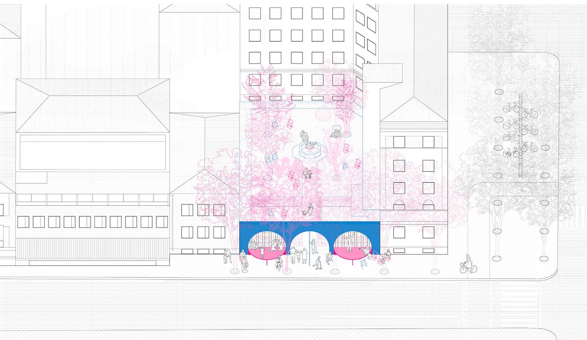 Il Pezzetto is a playful urban device that parasites the existing dividing wall between Calle Bustamante and the semi-private garden. This element, characterized architecturally by the sequence of three large arches, is currently a physical barrier that separates the two urban areas spatially, leaving them only in visual communication.